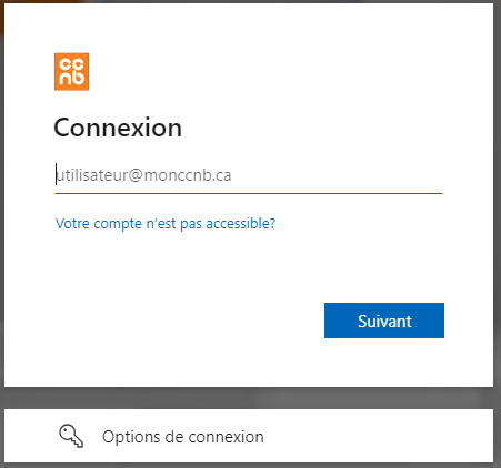 2 – Dans la fenêtre de connexion, veuillez entrer votre nom d’utilisateur suivi de @monccnb.ca. Cliquez par la suite sur le bouton « Suivant ».